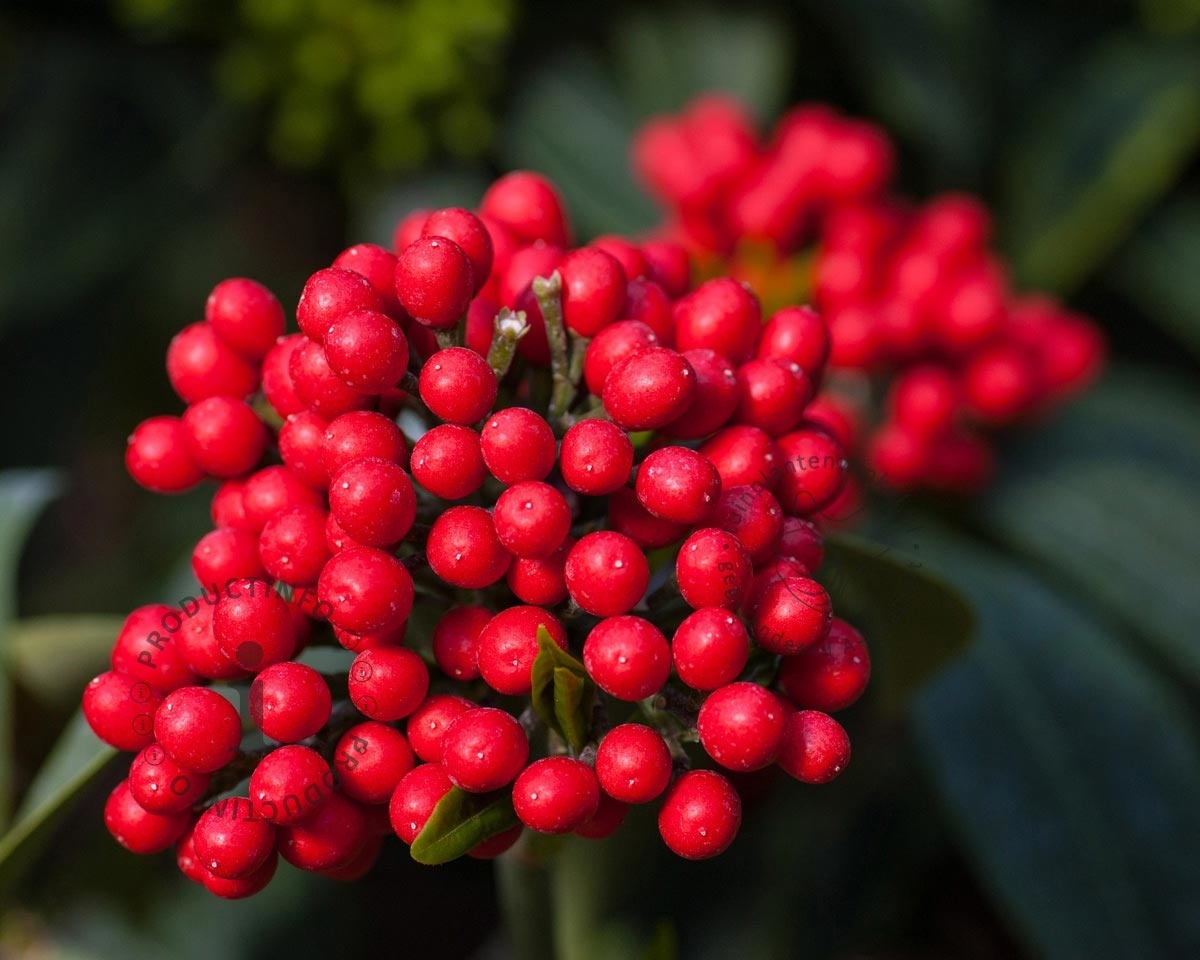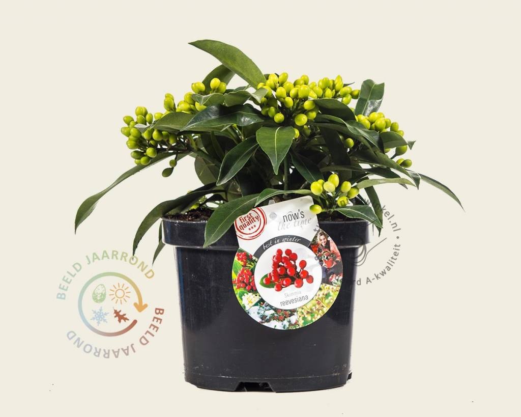 Skimmia reevesiana is een eenhuizige soort: een combinatie van een mannelijke plant en vrouwelijke plant. Dat betekent ook dat er bloemen en bessen aan één plant gevormd worden. Eerst bloeit de Skimmia japonica subsp met pluimen (bolvormige groeiwijze) van kleine, witte, geurende bloemen, daarna vormen zich witgroene bessen, die in februari prachtig rood kleuren. De takken met het donkergroen, glanzende, leerachtige blad en de rode bessen van reevesiana Skimmia zijn gewild bij mensen met groene vingers voor het maken van winterboeketten en kerststukjes en zorgen natuurlijk voor het wintergroene accent in de tuin of op het balkon of terras (in een pot). De struik kun je goed combineren met grote heesters, die meer naar achter in de border staan. De meeste skimmia's zijn goed winterhard.
