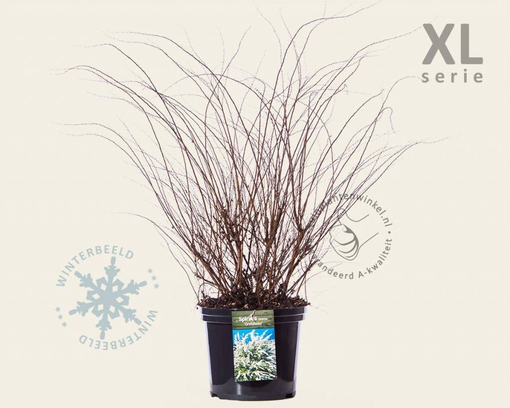 Spiraea cinerea 'Grefsheim' staat mooi als solitair in de grotere border, maar kan bijvoorbeeld ook prima als losse haag gebruikt worden. Het is een prachtig gezicht als tijdens de bloei van eind maart tot in april de lange pluimen met talrijke, witte bloemetjes aan de Spierstruik verschijnen. Deze XL-uitvoering wordt geleverd met een hoogte van 60 tot 100 cm en is meteen al een wat grotere struik. Uiteindelijk wordt de tuinplant 150 cm hoog.