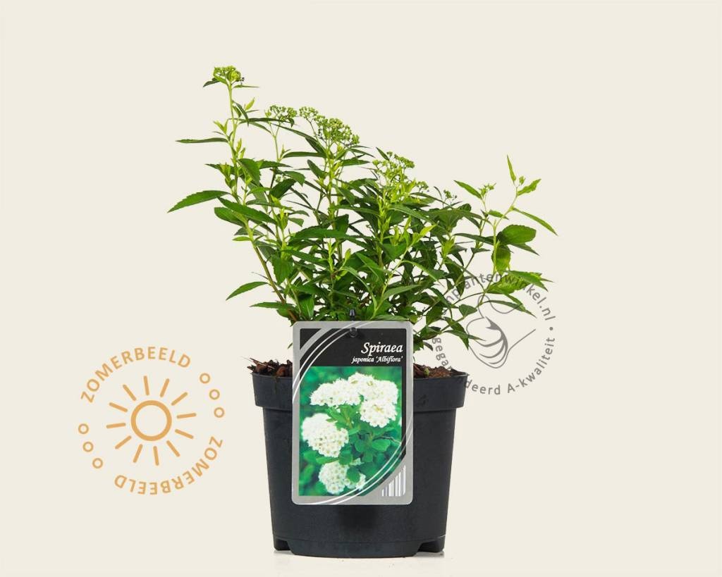 De Spiraea japonica 'Albiflora' geeft witte bloemen in de maanden juni augustus. Als de bloemen zijn uitgebloeid mag u deze afknippen, de plant maakt dan nieuwe scheuten en dus ook nieuwe bloemen. Hierdoor zorgt u dat de plant nog in augustus bloeit.