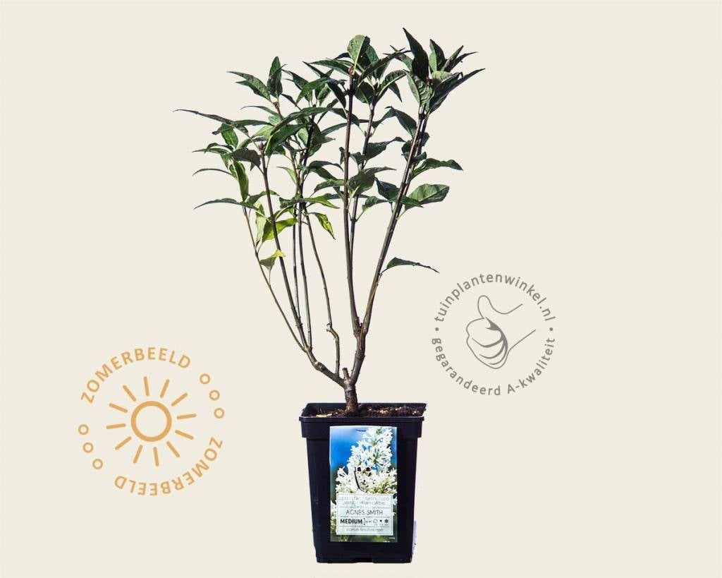 Syringa 'Agnes Smith' is een Sering uit de Villosae-groep. De bloemen geuren net als bij de Syringa vulgaris heerlijk. Syringa 'Agnes Smith' bloeit rijkelijk met witte, zich vertakkende, kegelvormige bloemen in trossen. De tuinplant groeit bossiger dan de Syringa vulgaris en blijft ook ietwat compacter en kleiner. De struik is geschikt als solitair op het grasveld, ideaal langs het terras of tuinpad, zodat u optimaal kunt genieten van de lekkere geur. Ze is goed winterhard en verliest zijn bladeren in het najaar.