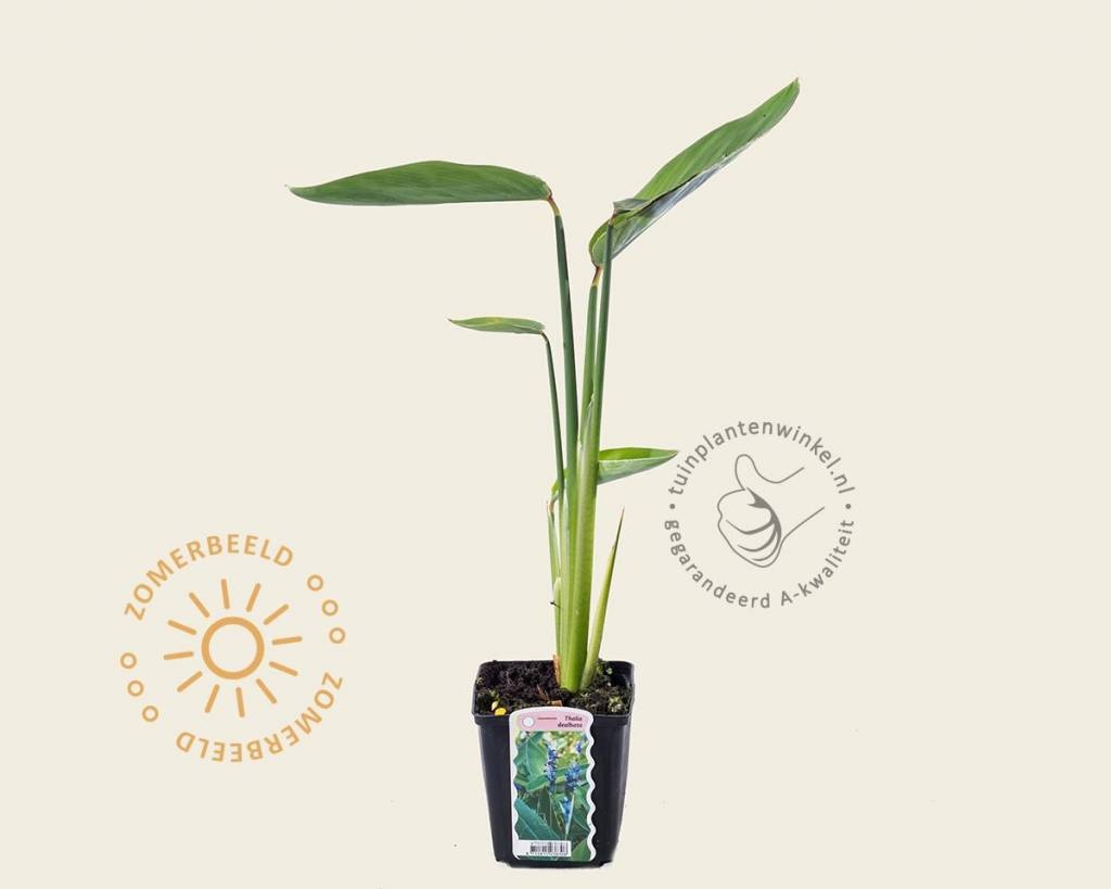 De bladeren van Thalia dealbata zijn blauwgroen van kleur en breed lancetvormig. Thalia bloeit van juli tot september met kleine, blauwpaarse bloemen. Geef Thalia de ruimte om uit te groeien. De waterplant trekt vlinders en bijen aan, kan tegen zeewind en verliest in het najaar zijn bladeren
