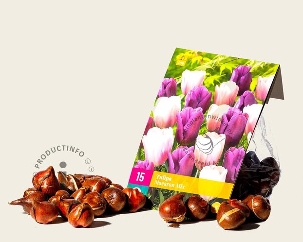 De Tulp is voor Nederland het meest belangrijke bolgewas. De Nederlandse tulpenteelt en -veredeling is wereldberoemd. Er zijn 1000en soorten tulpen. Tuinplantenwinkel biedt een assortiment aan van sterke soorten die opvallen door hun kleur of bloeiwijze. Deze Macaron Mix is een combinatie van twee tulpen uit de Triumph-groep. Triumph tulpen kenmerken zich door hun klassiek gevormde, enkele ovale bloemen die op een sterke stengel staan. In de Macaron Mix is een donkerpaarse bloem gecombineerd met een lichtroze. Deze prachtige combinatie staat perfect in een bloempot.