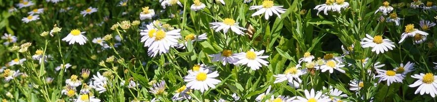 Kalimeris bloeit de hele zomer met fijne, witte of blauwe bloemetjes met een geel hartje.