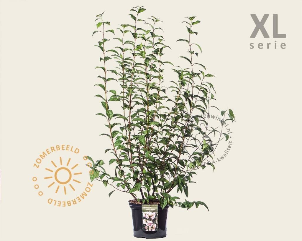 Viburnum bodnantense 'Charles Lamont' - XL bloeit als een van de weinige tuinplanten in de winterperiode: januari-februari en heeft dan ook de meeste sierwaarde. De bloemen verkleuren van lichtroze naar roze en zijn heerlijk geurend. De bloei begint vaak in december en duurt voort tot het einde van de winter. De groei is vrij smal omdat de takken vrij steil omhoog groeien. In de lente verschijnt het blad, dat in eerste instantie een rode kleur heeft. Na verloop van tijd kleuren de bladeren donkergroen. Bij het kneuzen van het blad komt een scherpe geur vrij. In de herfst kleurt het blad oranjerood en er vormen zich na de bloei purperkleurige bessen.