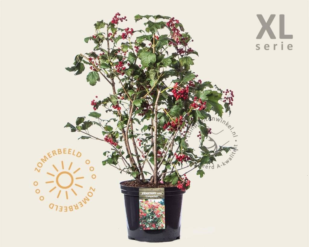 Viburnum opulus 'Compactum' - XL is het hele jaar door een mooie tuinplant en geliefd bij de vogels. De compacte groeiwijze van de Gelderse roos maakt hem ook geschikt als haagplant. Opvallend zijn de witte bloemschermen, met kleine, vruchtbare bloemetjes in het midden, waar in het najaar de rode besjes uit voortkomen, met daar omheen aan de rand de grotere, onvruchtbare bloemen, die heerlijk ruiken. De besjes zijn een lekkernij voor de vogels. De nectar is geliefd bij bijen. De Gelderse roos is een inheemse plant. Dat betekent dat we de tuinplant ook in de vrije natuur in vochtige gebieden tegen kunnen komen.