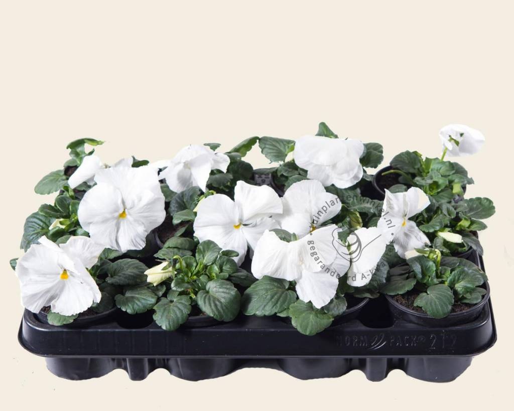 Grootbloemige winterviolen verschijnen in vele kleuren. Deze bloeit met witte effen gekleurde kroonbladeren. Dit viooltje bloeit gedurende de hele winter. Bij vorst beschermt de plant zichzelf door plat op de grond te gaan liggen. Wanneer de temperatuur boven het vriespunt stijgt staat het viooltje weer fier overeind. De bloei duurt voort tot diep in het voorjaar. Afhankelijk van de temperatuur blijft dit éénjarig plantje mooi tot eind april - juni.