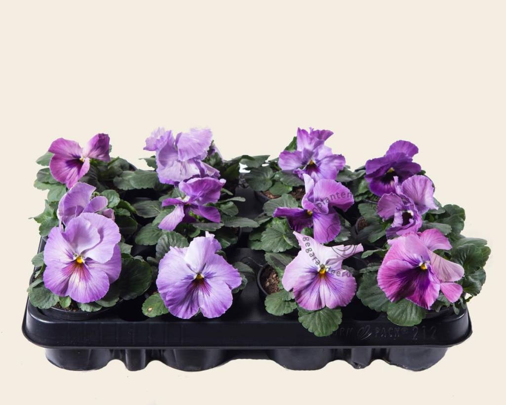 Grootbloemige winterviolen verschijnen in vele kleuren. Deze bloeit effen in verschillende tinten lila en roze. Bij elkaar een zeer fraaie geheel. Dit viooltje bloeit gedurende de hele winter. Bij vorst beschermt de plant zichzelf door plat op de grond te gaan liggen. Wanneer de temperatuur boven het vriespunt stijgt staat het viooltje weer fier overeind. De bloei duurt voort tot diep in het voorjaar. Afhankelijk van de temperatuur blijft dit éénjarig plantje mooi tot eind april - juni.