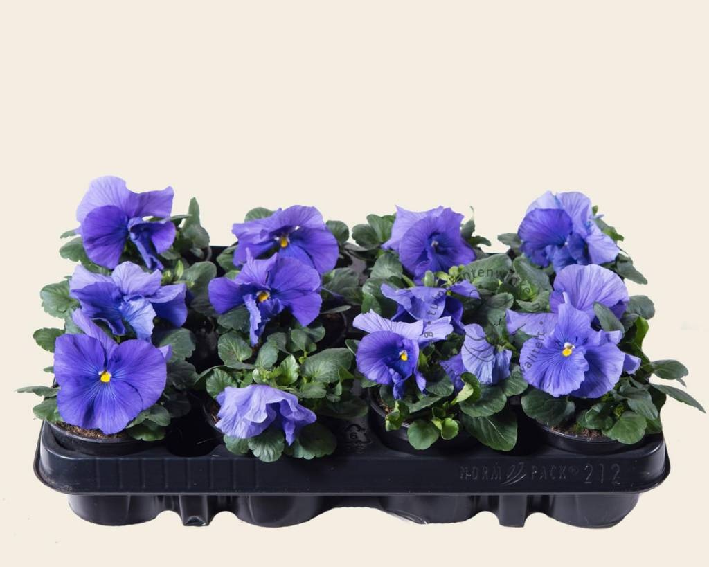 Grootbloemige winterviolen verschijnen in vele kleuren. Deze bloeit met licht-blauw effen gekleurde kroonbladeren. Dit viooltje bloeit gedurende de hele winter. Bij vorst beschermt de plant zichzelf door plat op de grond te gaan liggen. Wanneer de temperatuur boven het vriespunt stijgt staat het viooltje weer fier overeind. De bloei duurt voort tot diep in het voorjaar. Afhankelijk van de temperatuur blijft dit éénjarig plantje mooi tot eind april - juni.