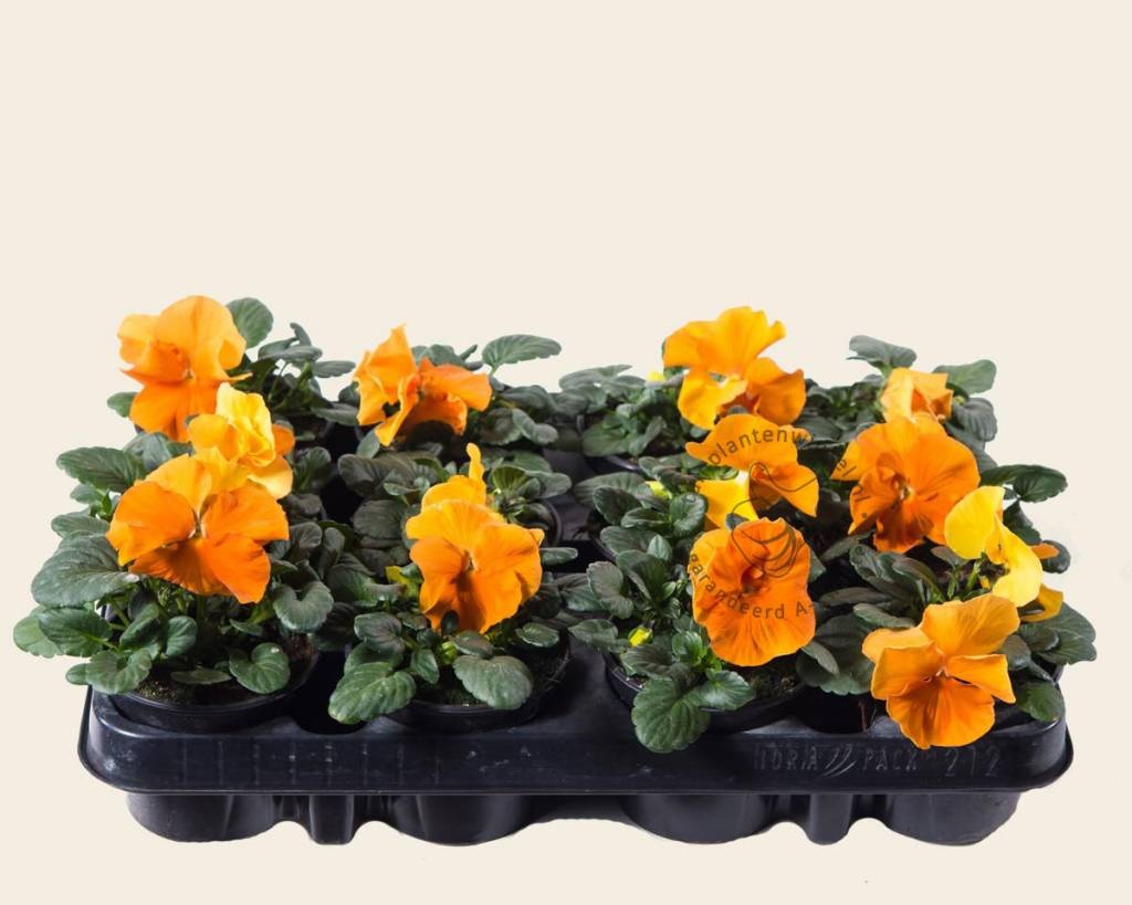 Grootbloemige winterviolen verschijnen in vele kleuren. Deze bloeit met oranje effen gekleurde kroonbladeren. Dit viooltje bloeit gedurende de hele winter. Bij vorst beschermt de plant zichzelf door plat op de grond te gaan liggen. Wanneer de temperatuur boven het vriespunt stijgt staat het viooltje weer fier overeind. De bloei duurt voort tot diep in het voorjaar. Afhankelijk van de temperatuur blijft dit éénjarig plantje mooi tot eind april - juni.