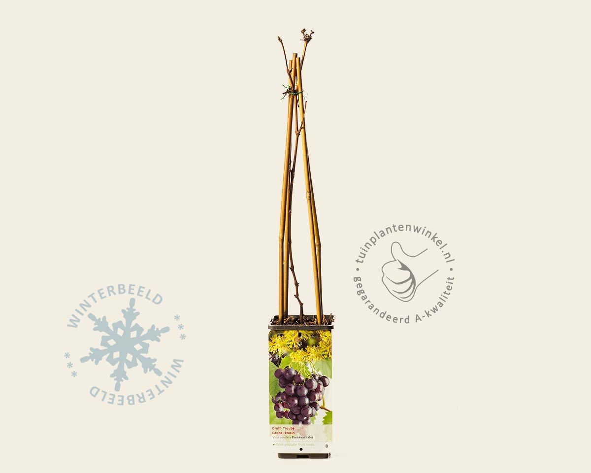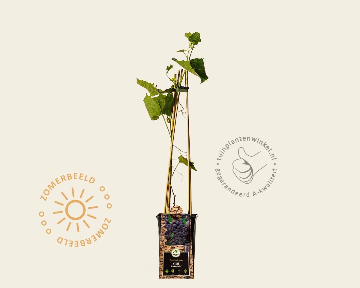 Vitis vinifera 'Frankenthaler' is een heerlijke druivenvariëteit met grote, donker gekleurde vruchten. Deze druif is ook geschikt als kasdruif. Op een meer koelere standplaats raden wij aan te kiezen voor de 'Boskoop Glory' of 'Regent'.