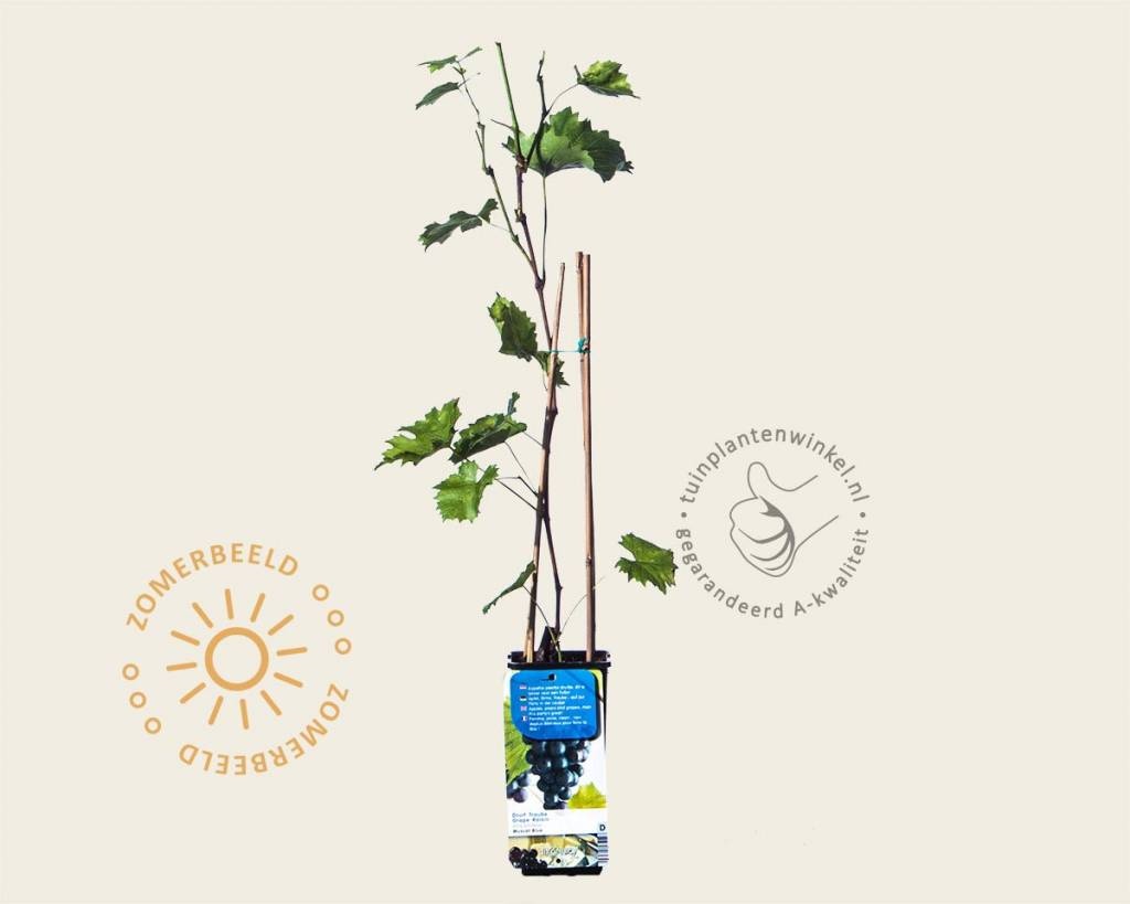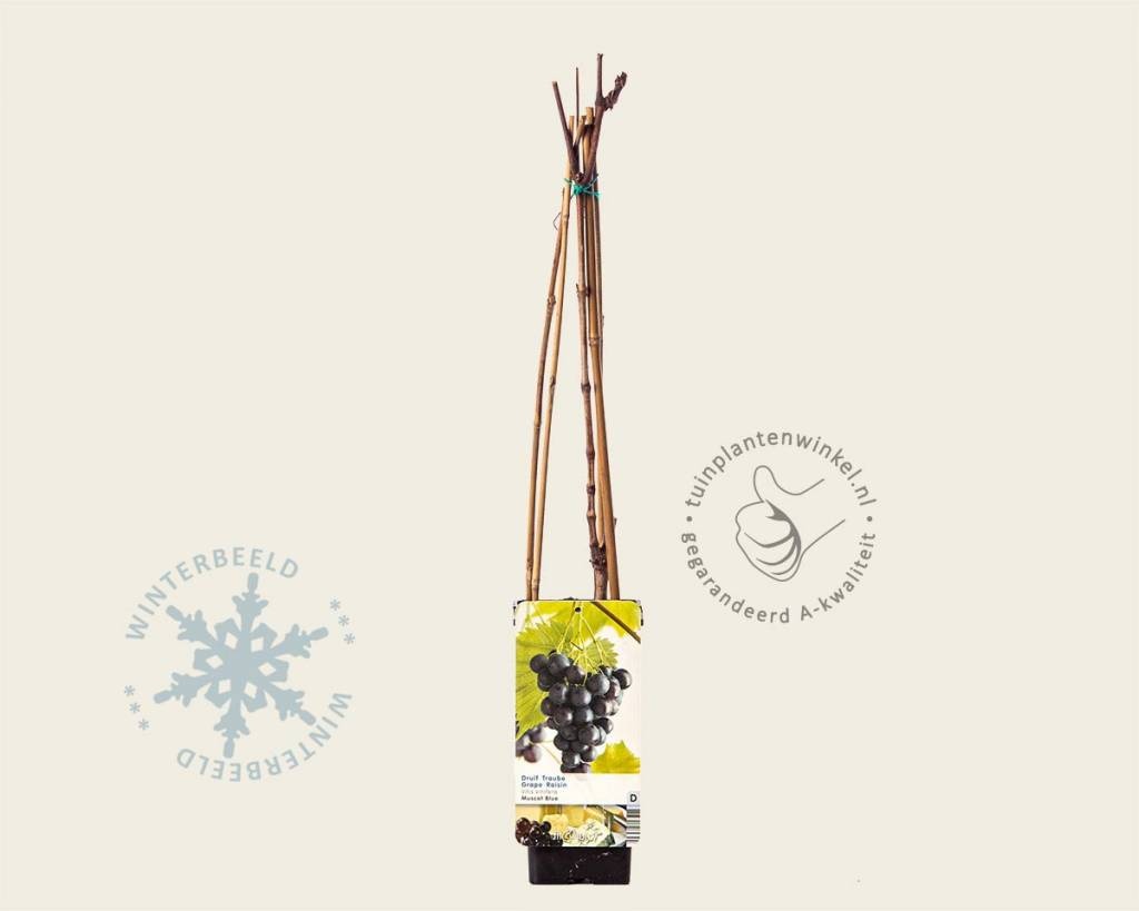 Vitis vinifera 'Muscat Blue' is een vroegrijpe druivensoort. Na de onopvallende bloei in april/mei verschijnen de grote trossen gedurende de zomer. In augustus kan er al met het oogsten van de sappige blauwe Muskaatdruiven met hun zoete muskaatsmaak begonnen worden. De Vitis vinifera druivenrassen (vinus is Latijn voor wijn) zijn geschikt om direct te eten, maar ook om wijn van te maken.