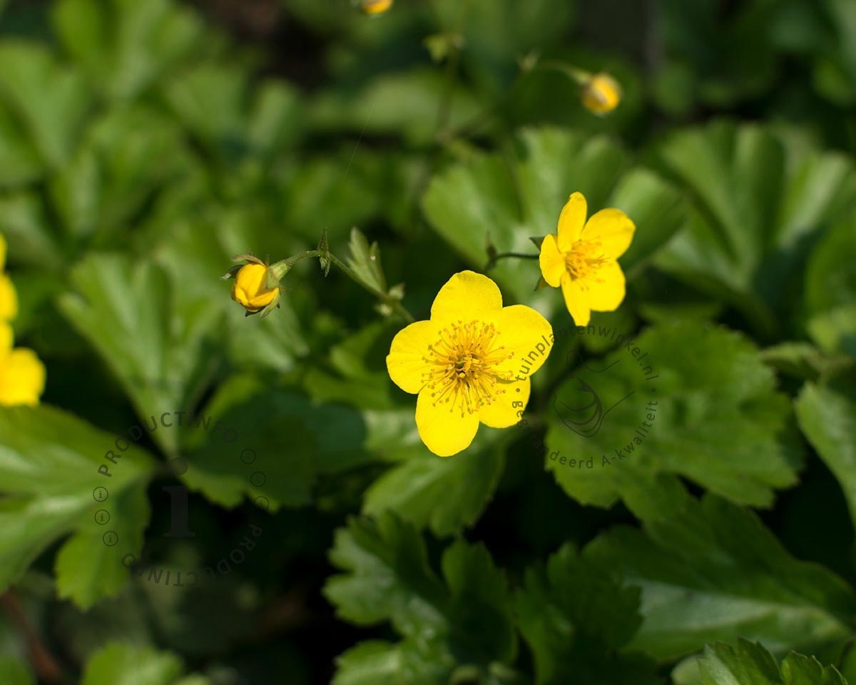Standplaats Waldsteinia ternata met gele bloemetjes