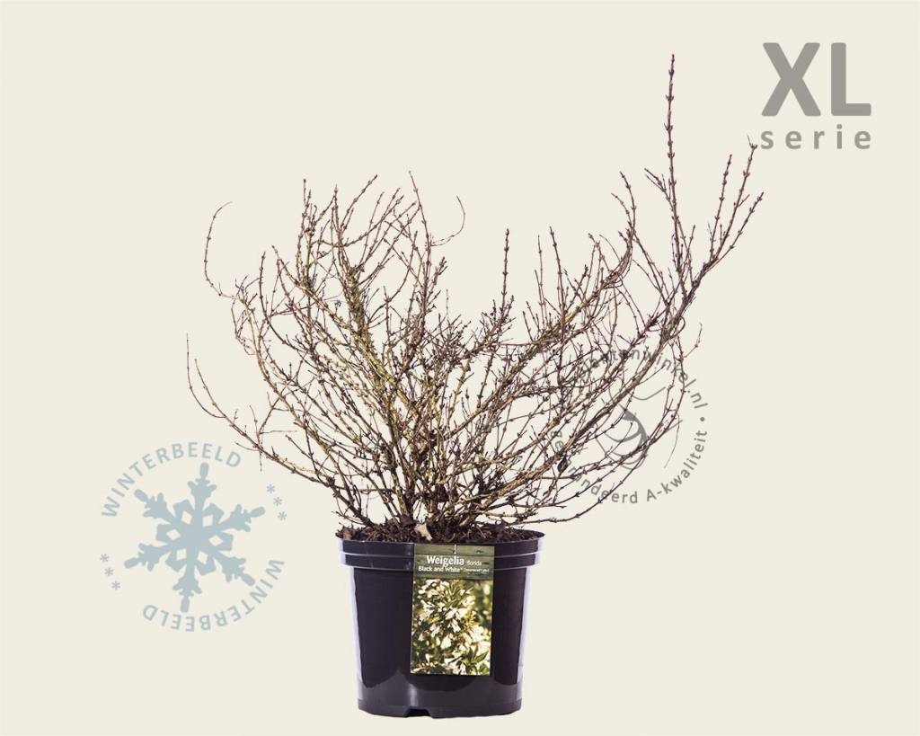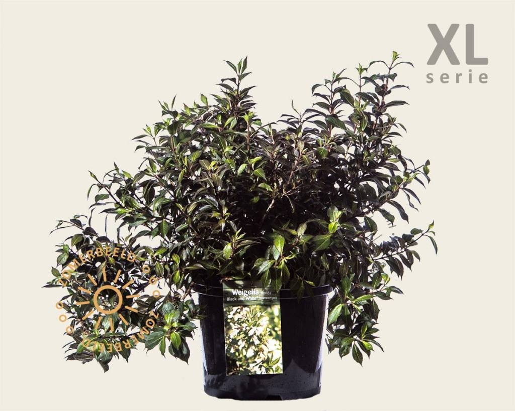 Weigela 'Black & White' - XL is een donkerbladige soort. De trompetbloemen verschijnen in mei/juni en zijn wit van kleur; ze combineren prachtig met het donkere blad. Vandaar de naam 'Black & White'. Weigelia is een compacte struik met een hoogte van 40 en een breedte van 70 cm. Nieuwe groeischeuten beginnen donkergroen en worden later donkerpaars.