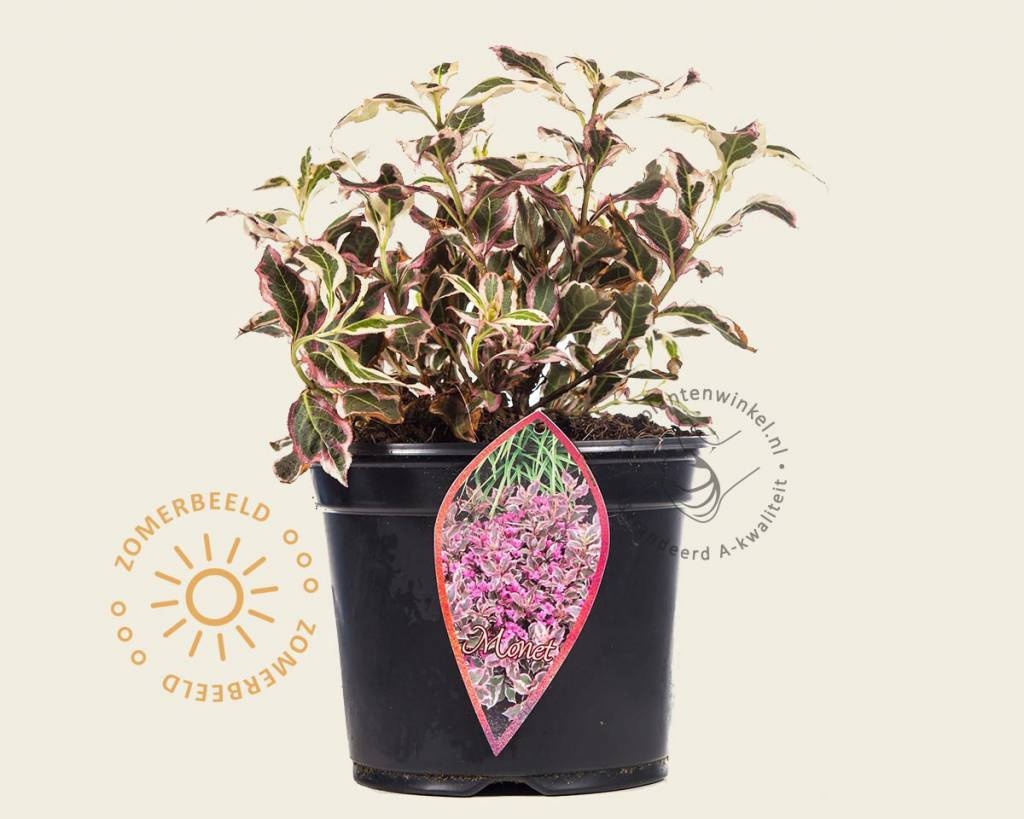 Weigela florida 'Monet' is een opvallende, bontbladige variant. De groene bladeren zijn langwerpig ovaal en hebben een crèmewitte rand. In de herfst komen er roze tinten bij. Dit dwergstruikje heeft een ronde, bossige groeiwijze. Weigela florida 'Monet' is geschikt om er klein haagje mee te vormen, staat mooi in elke tuin, ook aan de kust en in stedelijk gebied of kan in een sierpot op het balkon of terras staan. De Weigelia bloeit vaak tweemaal per jaar (mei/juni en september) met rozerode, trompetvormige bloemen, die heerlijk ruiken en bijen en vlinders aantrekken.