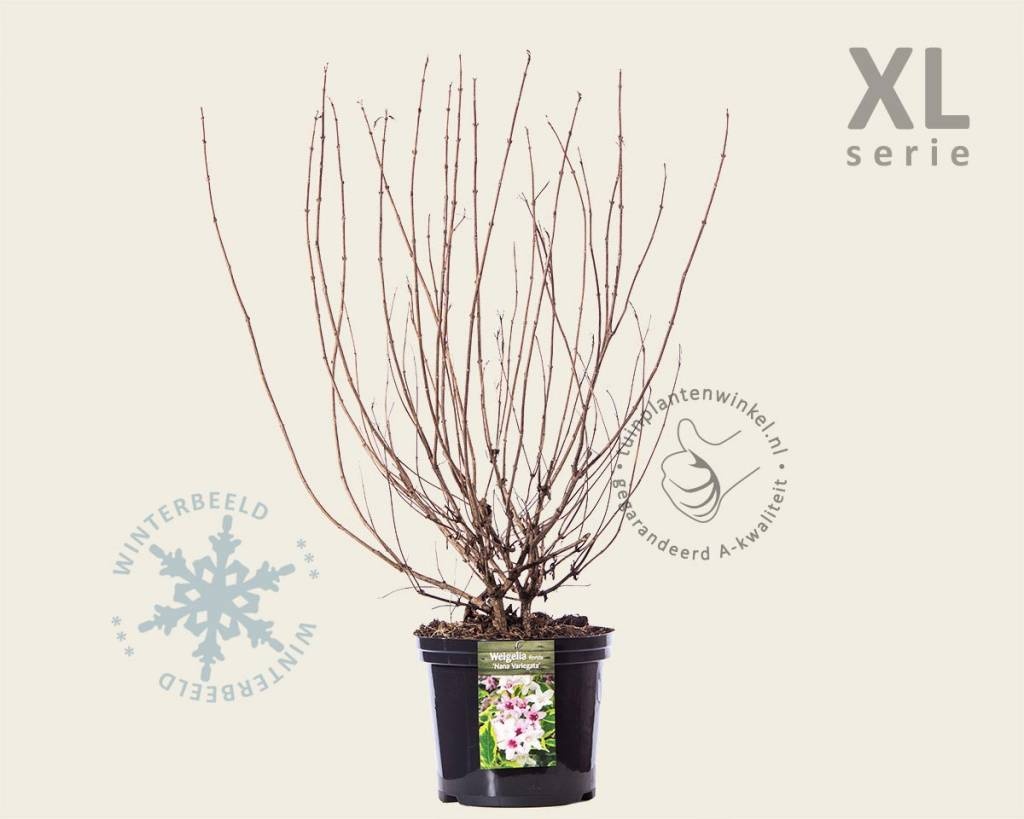 Weigela florida 'Nana Variegata' XL is een lagere, compactere variant met groene bladeren met een gele rand. De tuinplant krijgt in mei-juni trechtervormige, lichtroze, geurende bloemen, die bijen en vlinders aantrekken en heeft een uitbundige bloei. De tuinplant is bladverliezend en winterhard. Weigelia wordt toegepast als vakbeplanting in de border en als losse haagbeplanting.